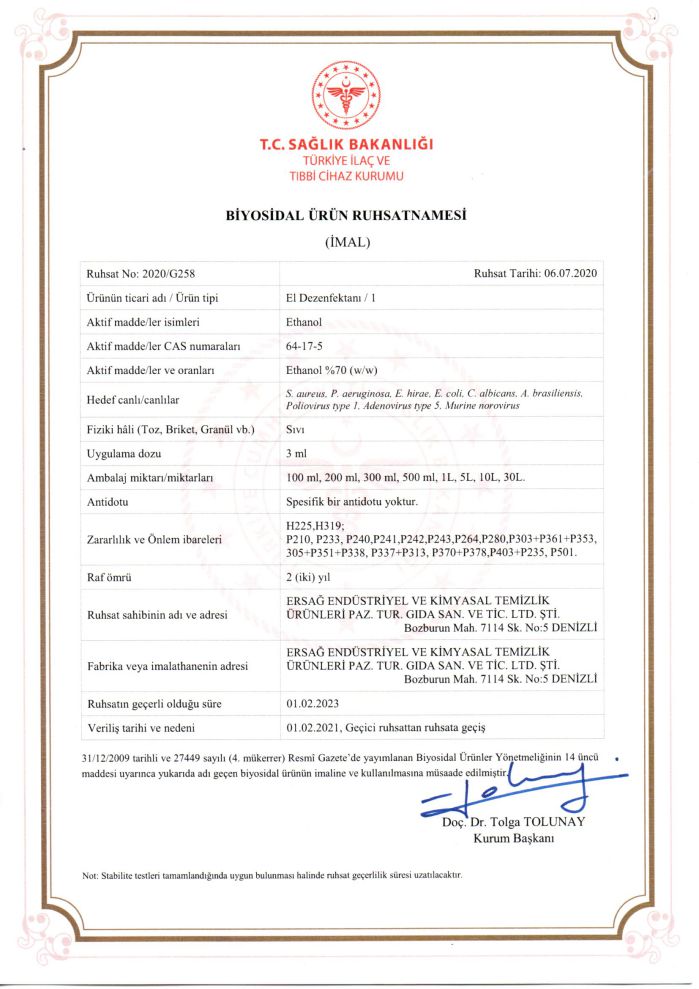 Resim Galerisi / Sertifikalar Buradasınız: Anasayfa Resim Galerileri Sertifikalar Biyosidal Ürün Ruhsatı Helal Belgesi Bildirim Kayıt Belgesi Marka Tescil Belgesi Satış Yetki Belgesi Organik Ürün Sertifikası Oda Faaliyet Belgesi Üretici Bildirim Formu ISO9001 Sertifikası ISO10002 Sertifikası ISO14001 Sertifikası ISO22000Sertifikası ISO45001 Sertifikası